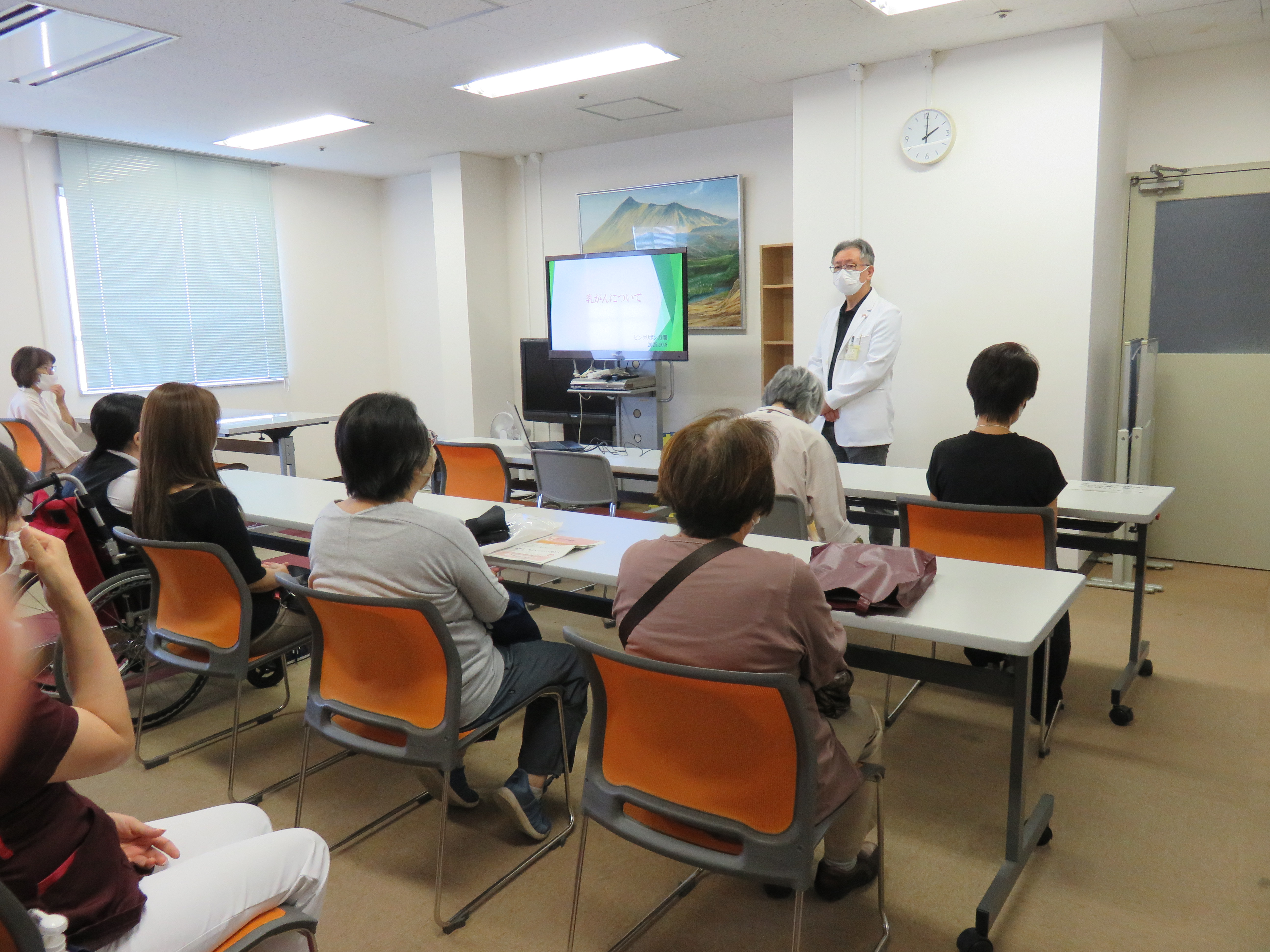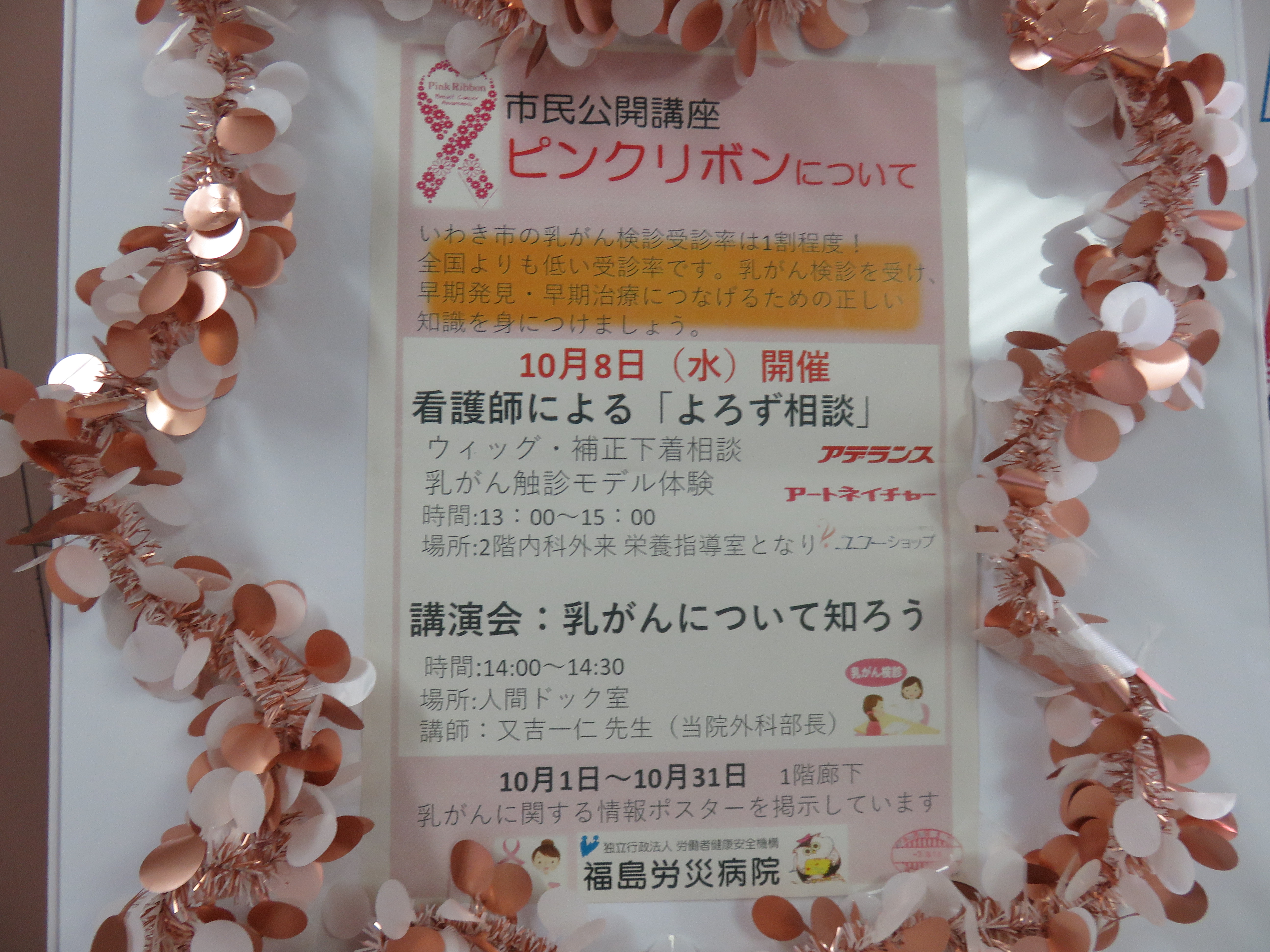 令和7年10月8日(水)に、乳がん検診の早期受診を推進する一助となればと考え、 ピンクリボン月間にちなんだイベントを院内で開催しました。 福島労災病院では、「がんとの共存」に向けて、乳がん検診、専門的治療、患者サロンの開催など、 地域住民の乳がん予防と治療を支援しており、今回のイベントもその一環です。看護師による「よろず相談」、 乳がん触診モデル体験・相談、ウィッグ・補正下着相談(アピアランスケアの充実)、 又吉一仁外科部長による「乳がんについて知ろう」と題した講演会を行いました。 10月は乳がんに関する情報ポスターを院内に掲示しておりますのでご覧ください。